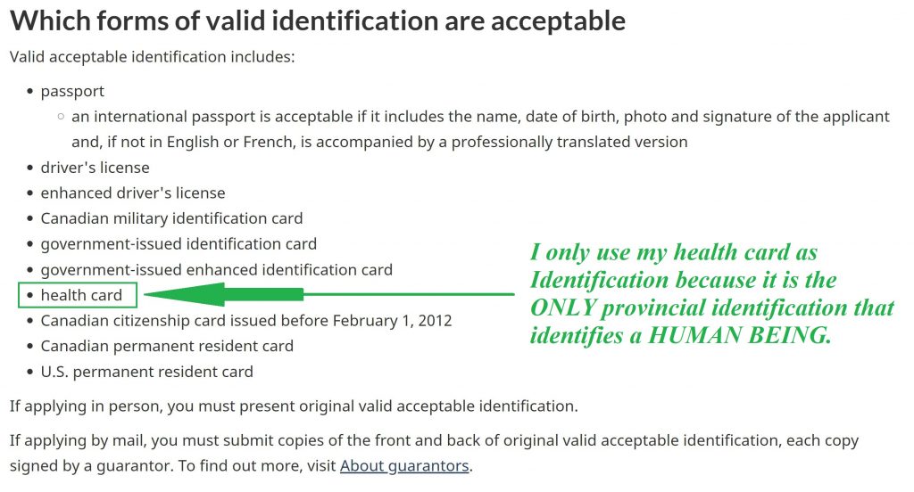 The only forms of identification I use are my Registration of Live Birth and my Ontario Health Card, which are both officially recognized forms of identification in the Corporation of Canada at the federal level and identifies myself as a human being.